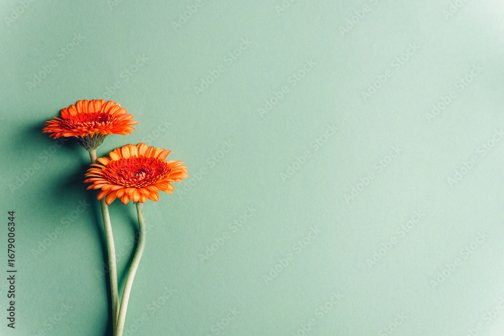 Two orange gerbera flowers on green background with copy space, minimal floral composition in bright colors. Top view, flat lay