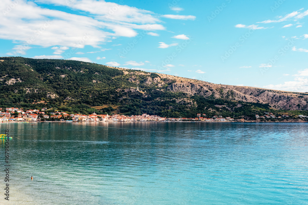 Coastal town with red roof houses and green hills reflecting in blue sea, scenic landscape of Baska town, Croatia, Adriatic