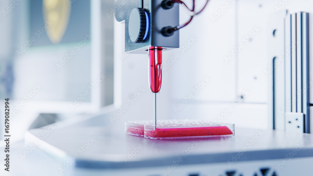 Medical Laboratory Bioprinting 3D Human TIssue and Muscles. Advanced Machine Manufacturing an Artificial Organ or Meat From a Digital CAD Model. Anatomy and Genetic Engineering Concept