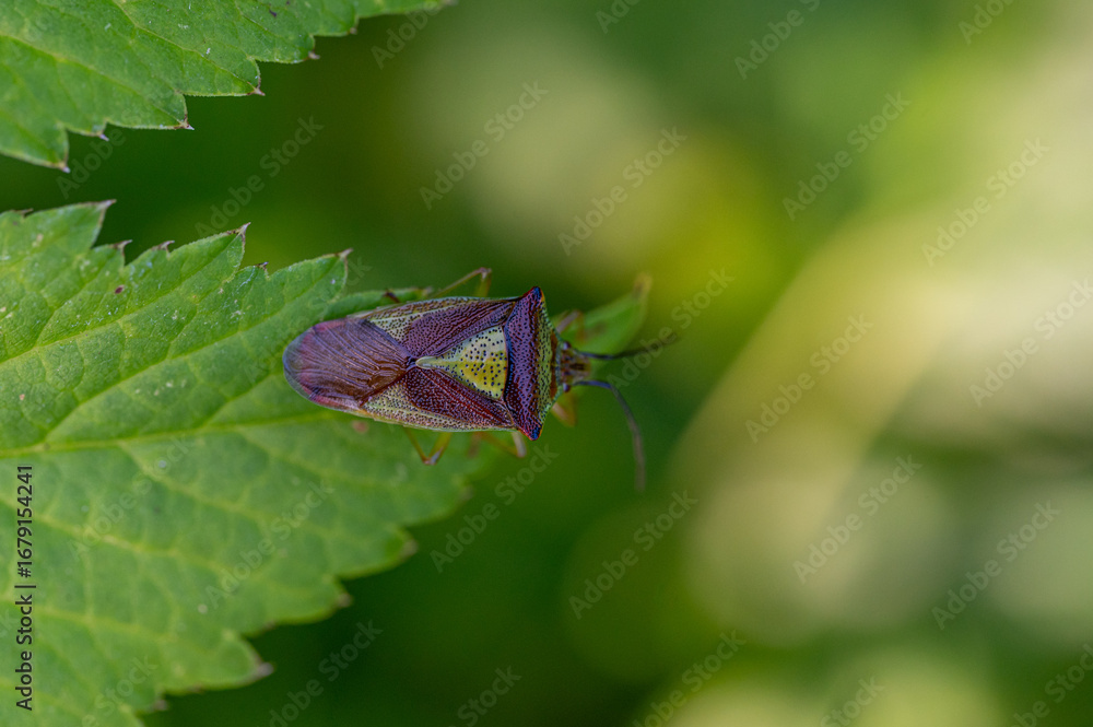 hawthorn shield bug on the tip of a leaf