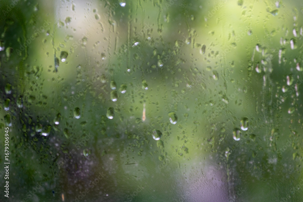 Raindrops glisten on a misty window, creating a serene backdrop of blurred greenery.