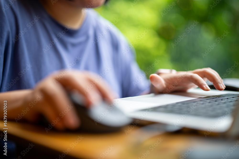 A woman focused on her laptop and mouse, working amidst a lush green backdrop.