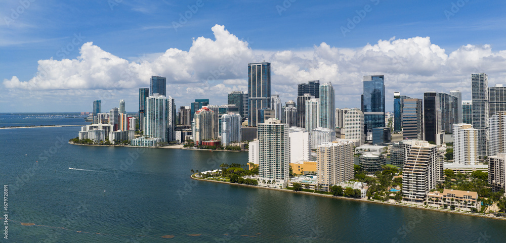 Aerial view of Brickell skyscrapers. Modern cityscape of downtown Miami. Panoramic Miamis skyline above the coastline. Brickell Key aerial view in Miami. Landscape of Miami. Miami Beach and Brickell.