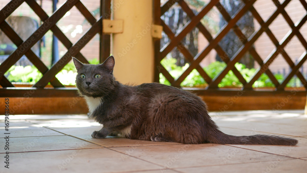 Attentive grey cat sitting alert on a tiled porch, pausing in mid-movement and looking upward with curious expression. The scene captures a moment of feline focus and readiness