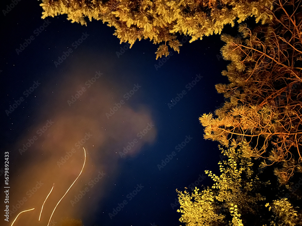 Night sky view framed by lush trees, showcasing a blend of stars and wispy clouds illuminated by warm light, creating a serene and tranquil atmosphere in nature