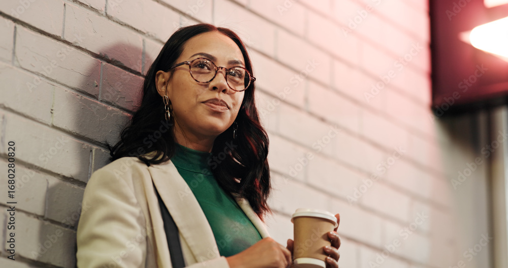 Businesswoman, coffee and memory in city at night, thinking and reflection with warm beverage on trip. Person, outdoor and perspective with smile, decision and inspiration with drink in Venezuela