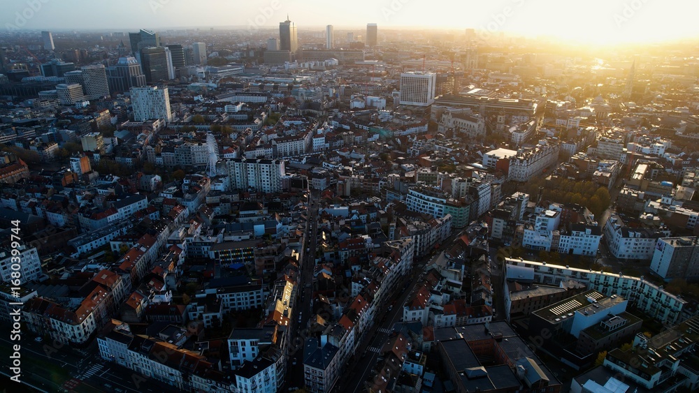 An aerial panorama view around the downtown of the City Brussels In Belgium on a cloudy spring morning
