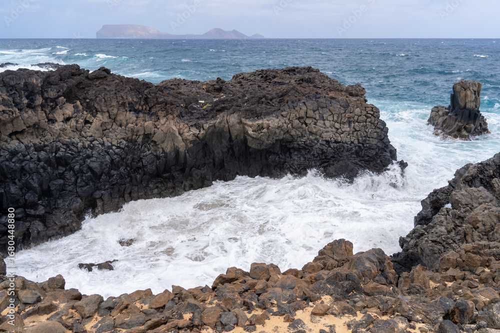 Waves crashing against rugged black volcanic rocks along the coast of La Graciosa, Lanzarote, with a view of the sea.