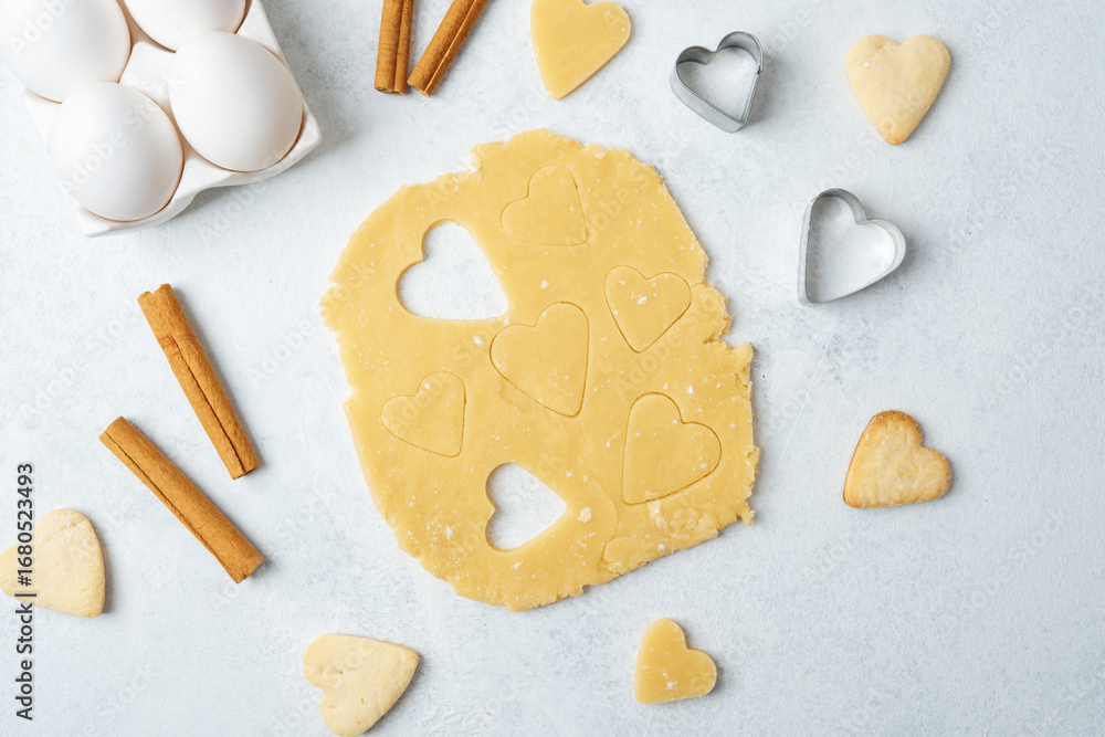 Heart shaped cookie dough cutting with cinnamon and eggs for baking, valentines or romantic concept