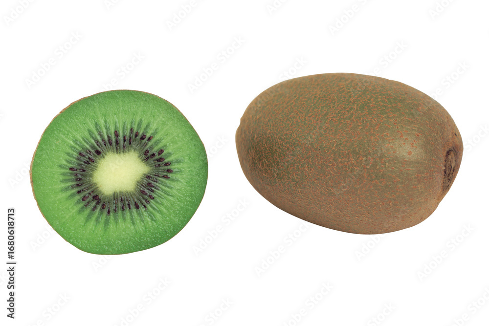 Whole kiwi fruit and his segments Kiwi fruit Front view close-up of an extremely perfect looking single kiwi fruit cut in half