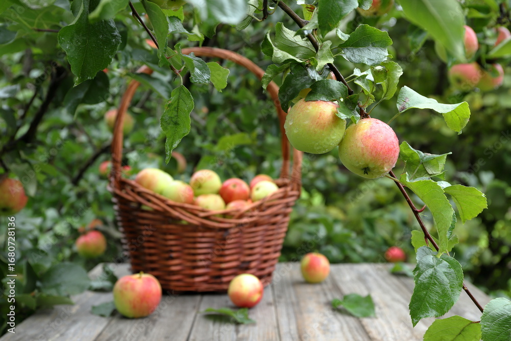 A pair of ripe apples with water droplets on an apple tree branch against the background of a wicker basket with fresh fruits on a wooden table in an autumn garden.
