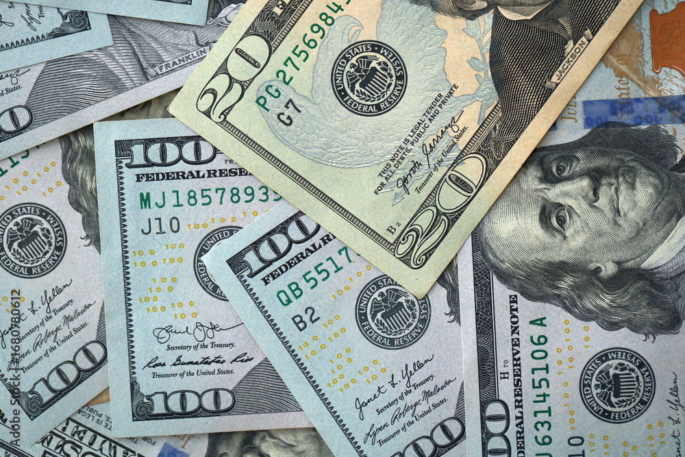 Big amount of different dollar bills close up. Hundred fifty twenty ten and five dollar banknotes