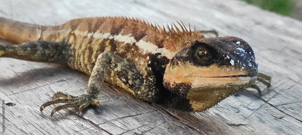 A close-up photograph of a lizard or Tree Lizard on a wooden surface, showing detailed scales and dorsal spines. A naturally colored chameleon is sitting on a wooden surface, showing the details of it