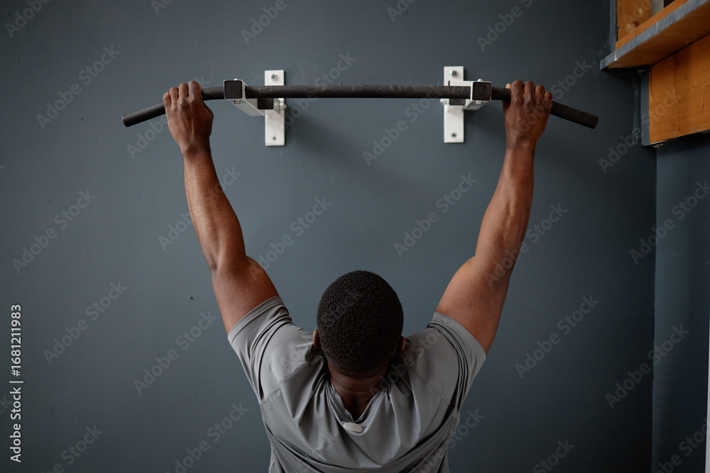 Black young adult man exercising by gripping pull up bar mounted on wall, viewed from behind, demonstrating strength training during house arrest in indoor setting