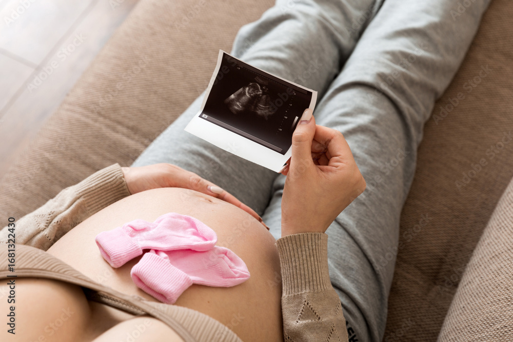 Pregnant Woman sitting on bed and Looking At Ultrasound Scan photo of her Baby. A pregnant female shows her ultrasound report and her unborn baby