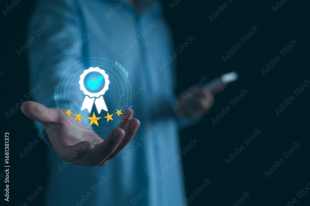 Quality certificate concept, businessman showing business standard guarantee, service quality assurance and warranty technology