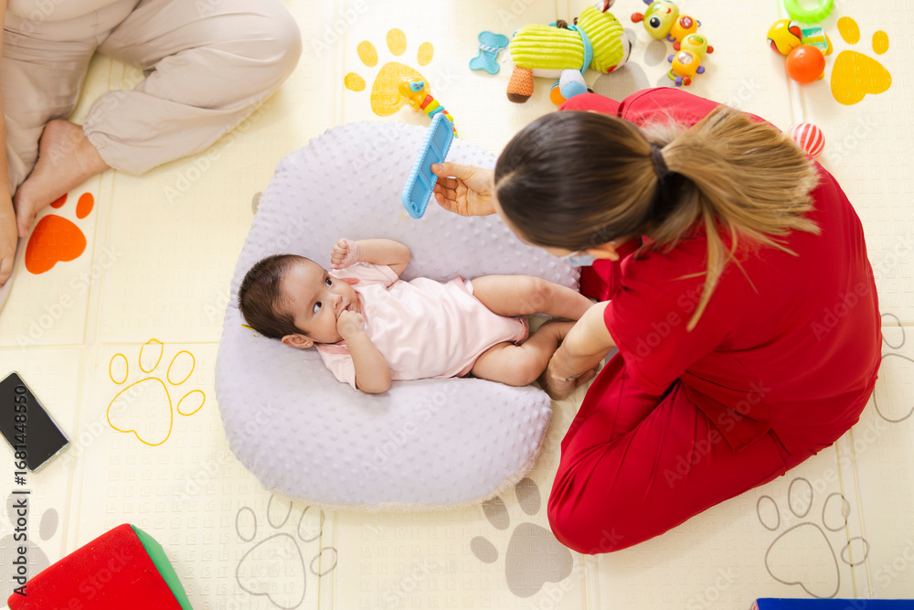 Physiotherapist stimulates a baby lying on a cushion with a toy during an early stimulation session, while the mother is sitting beside accompanying. The physiotherapist is pregnant.