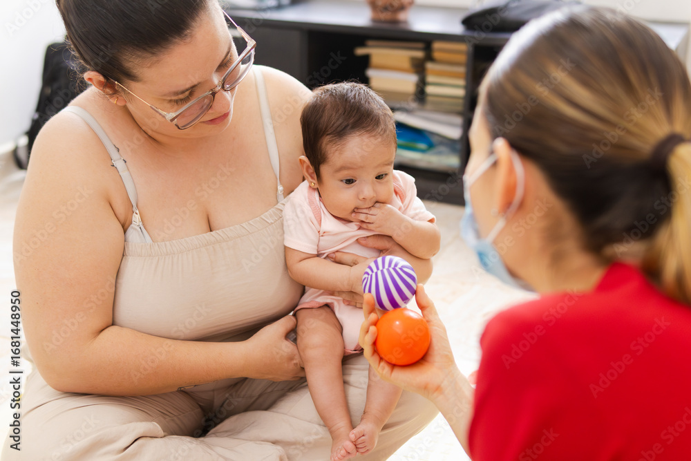 Mother and professional stimulate a 5-month-old baby with colorful balls, promoting well-being, care, and child development