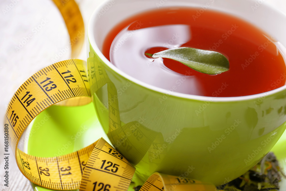 Closeup view of cup with tea, leaf and measuring tape on table. Weight loss concept
