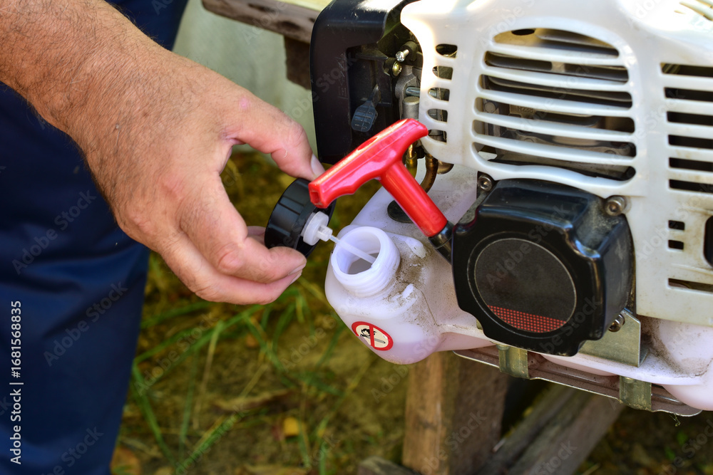 Maintenance of a petrol trimmer in a workshop. Removing the cap from the fuel tank.