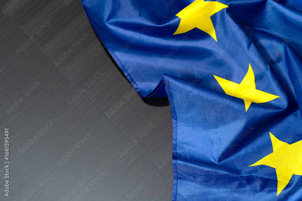 European Union flag placed on solar panel, symbolizing renewable energy, sustainability, green future, and clean power in Europe