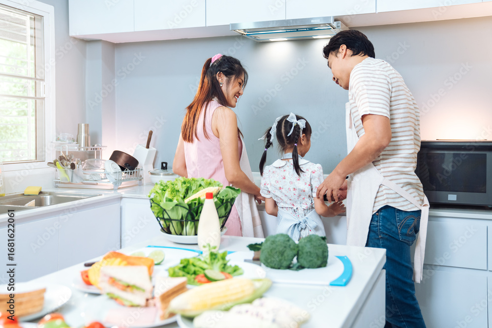 Family Cooking in Kitchen with Pregnant Mother, Father, and Child Preparing Vegetables, Fruits, and Bread for Healthy Nutrition and Balanced Lifestyle