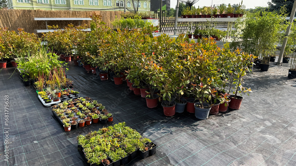 Potted plant symphony on urban rooftop, verdant oasis for Greenery Day, harmonizing eco-conscious urbanism with botanical diversity