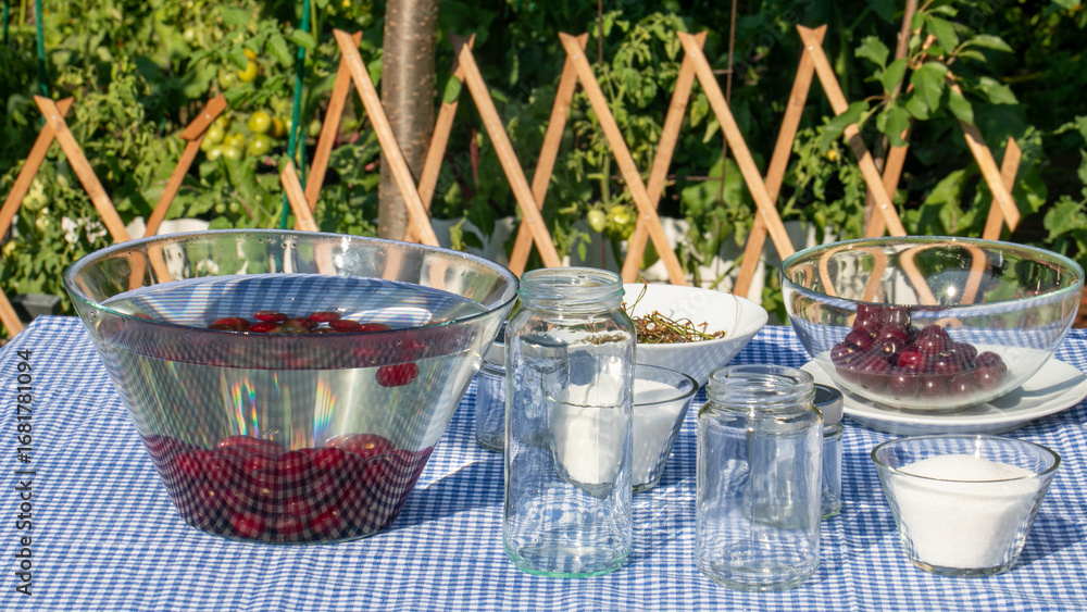 A sunlit patio with cherry jars on a checkered table for Fermentation Day, celebrating rustic pickling traditions