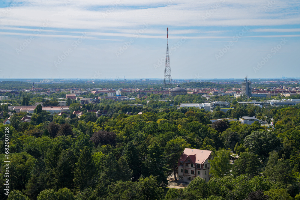 Leipzig from above. Viewpoint Völkerschlachtdenkmal (Monument to the Battle of the Nations). Skyline with Leipzig Radio Tower