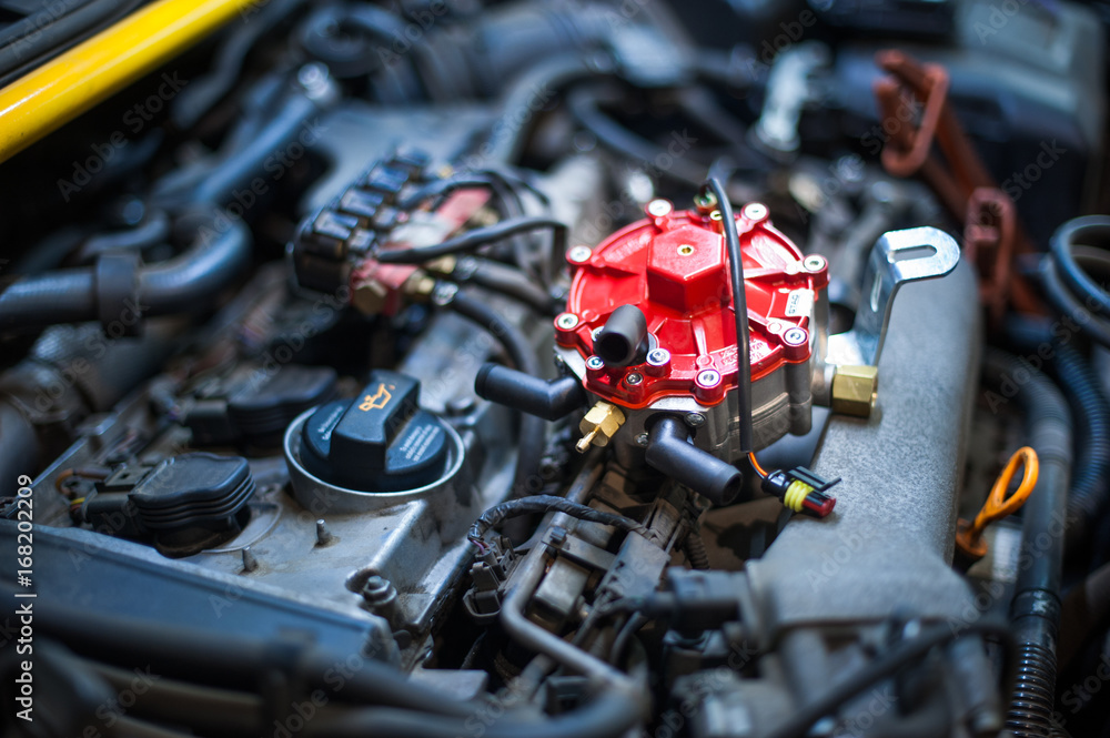 Reduktor gazu LPG przygotowany do montażu leżący na silniku. Wtryski gazu w tle.