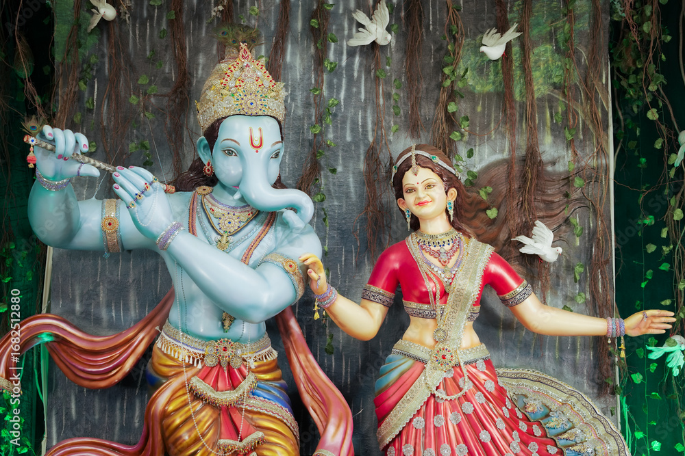 Ganesh as Krishna with Radha, Creative Ganesha playing flute, Artistic Ganpati and Radha idol, Unique Ganesh Krishna depiction Stock Photo.