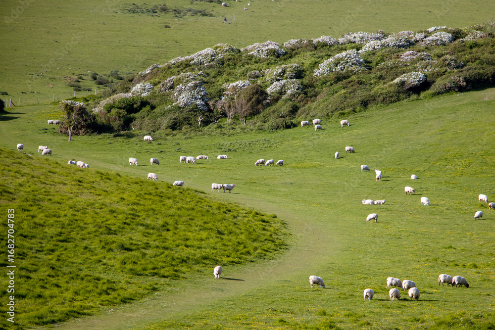 Flock of sheep grazing on a lush hillside in the English countryside
