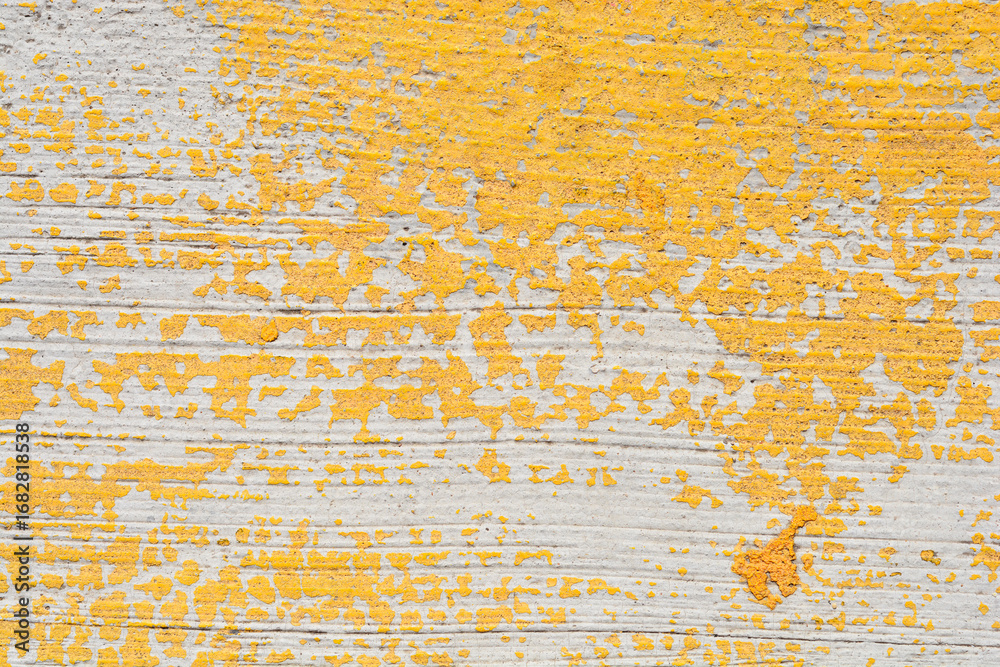 A horizontal close-up shot of a gray surface with peeling yellow paint and visible horizontal lines, creating a grunge and abstract background.