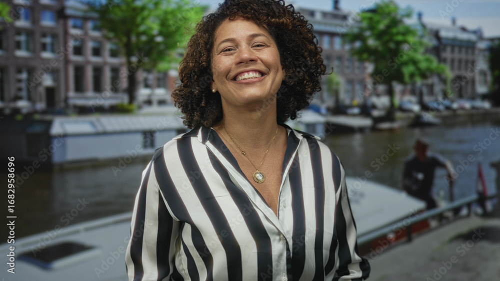 Woman with curly hair sticks her bare tongue out and smiles on a canal boat on a street; playfulness.