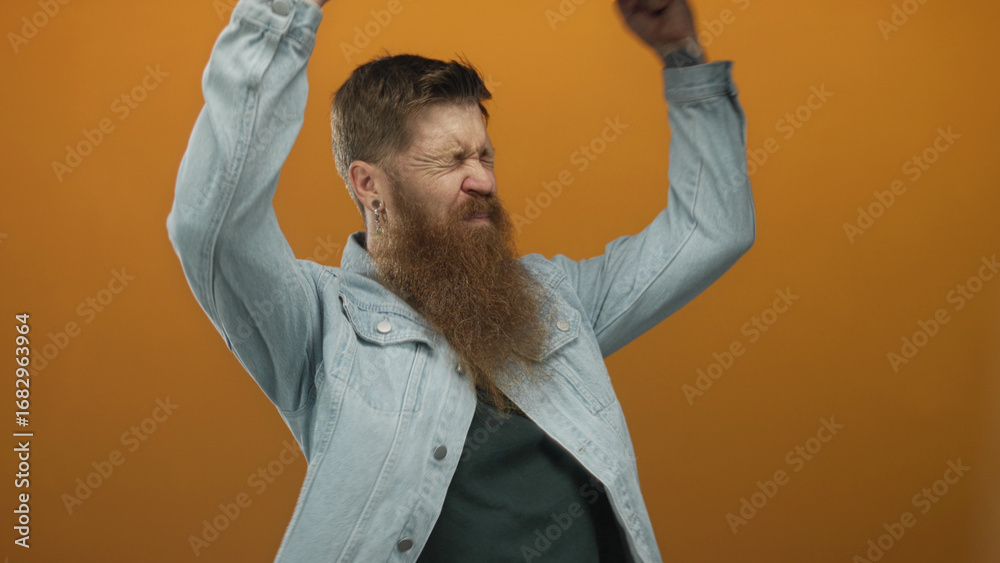 Man with beard and open mouth wearing denim jacket raises clenched fists in orange studio; excitement.