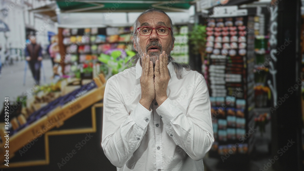 Man with hands on cheeks wearing red glasses at a crowded street market souvenirs stall, mouth open in shock; surprise curiosity wonder.