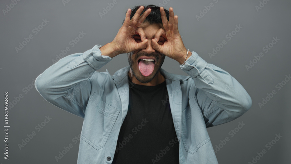 Hispanic man with short black hair making binocular gesture with hands and showing tongue in grey studio; playfulness.