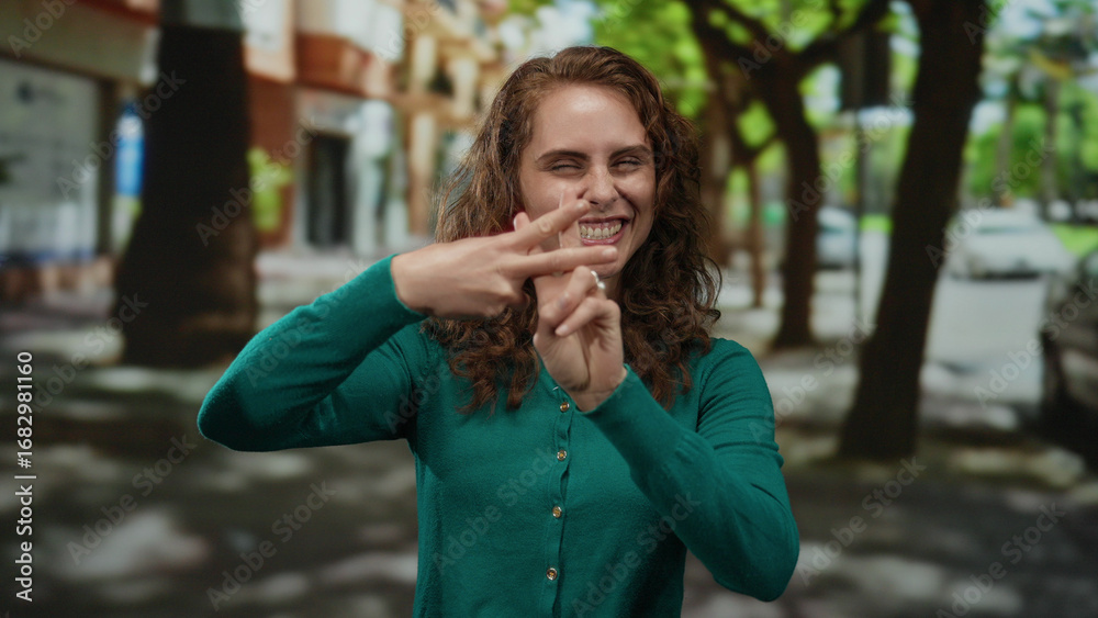 Young woman enjoying city life makes hashtag gesture on urban street lined with trees featuring a joyful expression signifying social media connectivity and modern lifestyle.