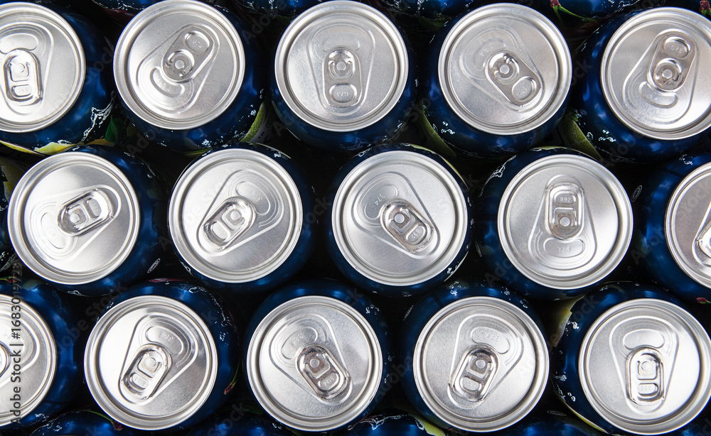 Aluminum beverage cans used in the food and brewing industries. Packaging made from recycled material.