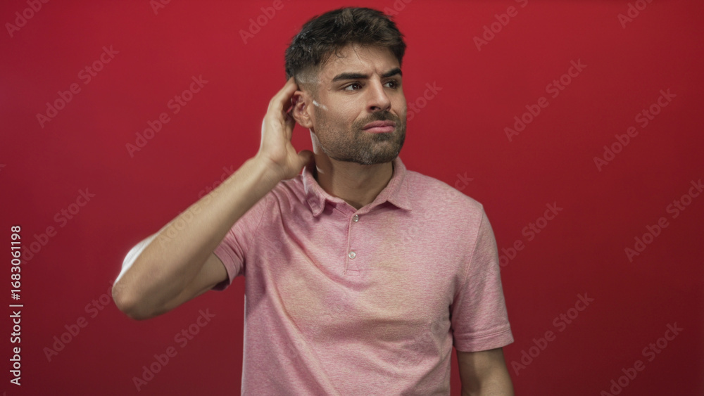 Man scratches his head and tilts his shoulder against a bright red studio wall, offering a puzzled expression; confusion.
