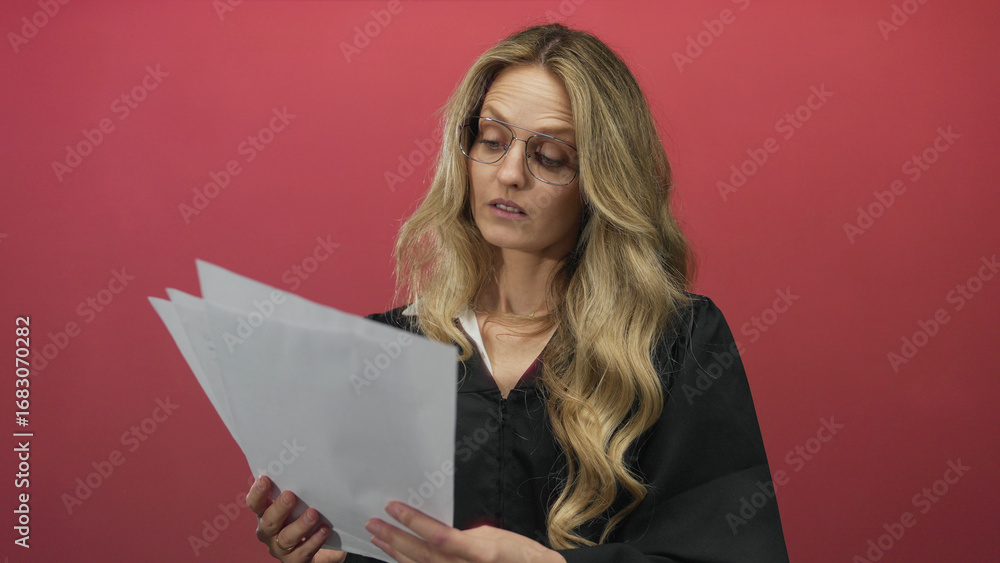 Woman judge with blonde hair wearing uniform reads documents against isolated red wall background.