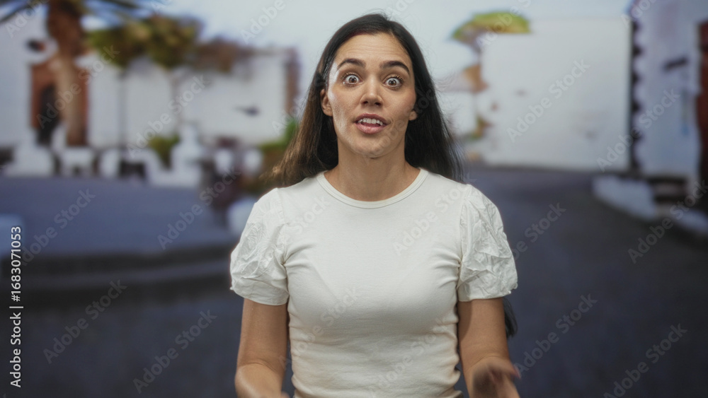 Young woman presses palms to cheeks in candid moment on busy street with blurred buildings behind; surprise.