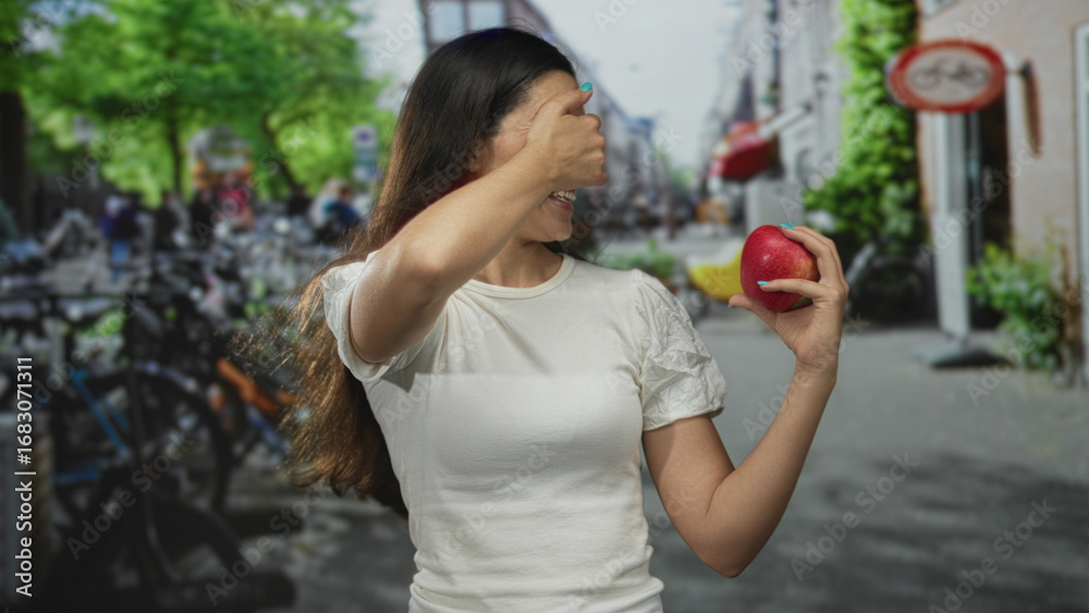 Hispanic young woman covering her eyes with hand holds red apple on bustling urban street; playfulness.