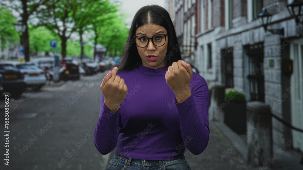Woman wearing purple sweater pointing fingers to chest on street clad in denim jeans with glasses visible; surprise reaction.