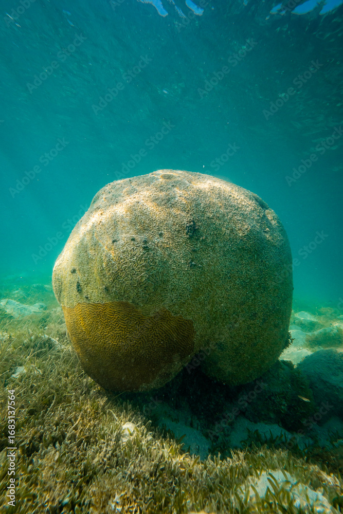 Destroyed Coral Reef located in Antigua island in the Caribbean, with broken pieces spread and green water, no fish