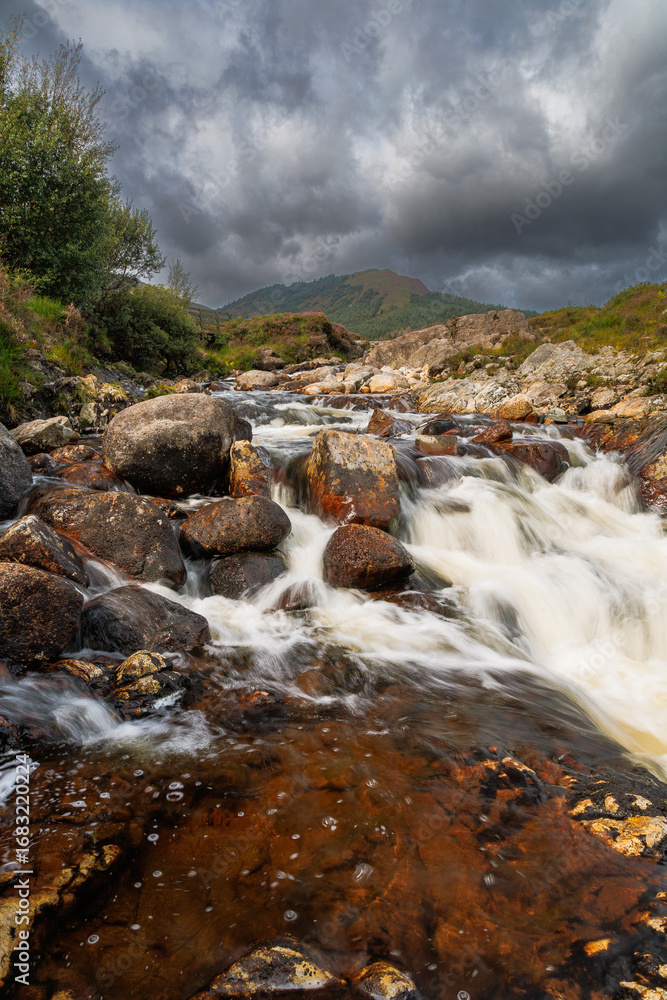 Scenic landscape of North Glen Sannox Waterfalls on the Isle of Arran, Scotland, with cascading water and rugged mountain scenery