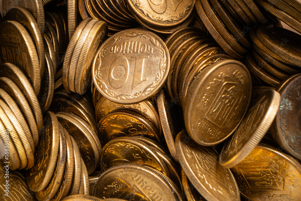 Close-up of a pile of golden Ukrainian 10 kopiyok coins.