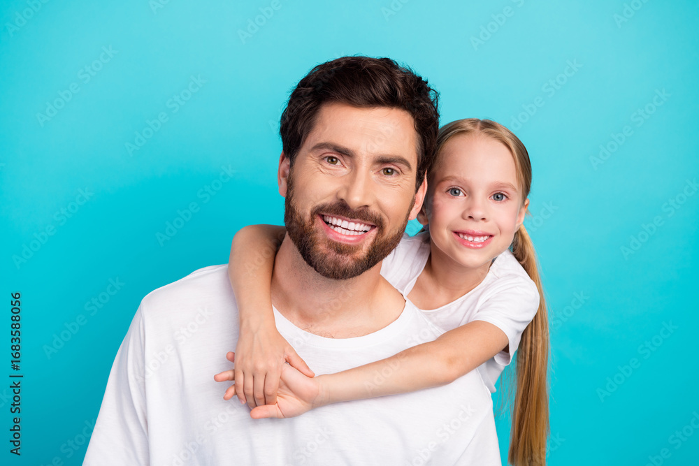 Happy father and daughter with bonding gesture on teal background embody togetherness, love, and strong family connection