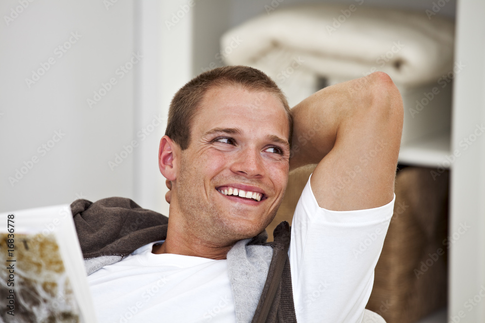 lächelnder junger Mann liest ein Buch