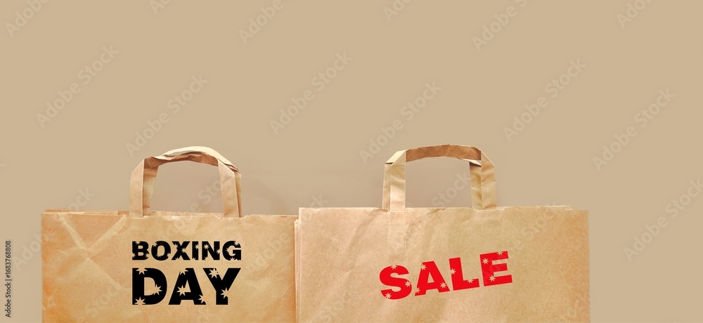 Boxing day sale, shopping paper bags with promotional illustration, text 'Boxing Day, Sale'. Happy boxing day concept